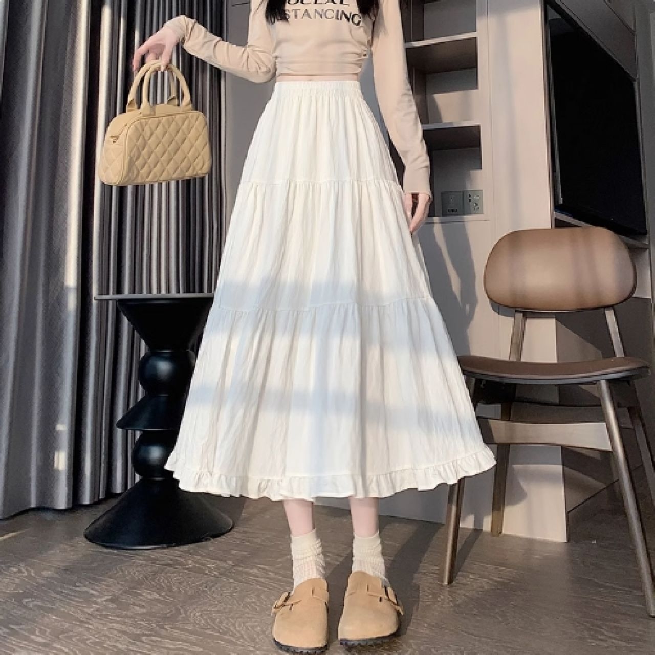 homepage> 男装/ 女装/ 内衣>女装>半身裙>Early Autumn New Style High-waist Slimming White Half Skirt for Women, with Design Sense, Medium and Long Length, A-line, Lotus-leaf Edge, Large Swinging Cake Skirt, ¥ 44.8